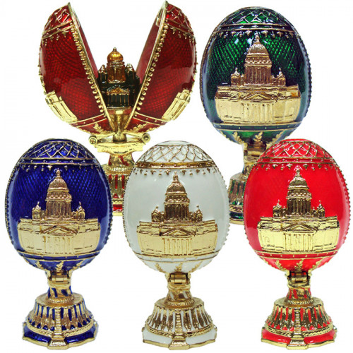 Яйцо-шкатулка под Фаберже внутри с Исаакиевским собором.  Изготовлено из металла,  покрыто цветной эмалью и украшено стразами.