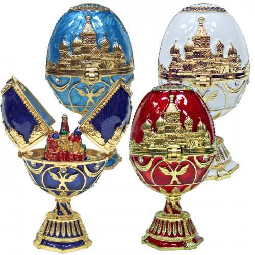 Яйцо-шкатулка под Фаберже внутри с храмом Василия Блаженного. Изготовлено из металла , покрыто цветной эмалью и украшена стразами.