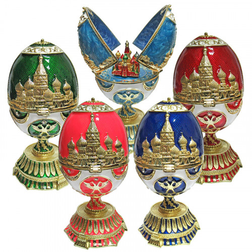 Яйцо-шкатулка под Фаберже внутри с храмом Василия Блаженного. Изготовлено из металла,  покрыто цветной эмалью и украшено стразами.