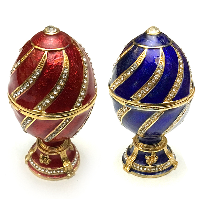 Роскошная шкатулка – яйцо в стиле Фаберже изготовлено из металла, покрыто холодной эмалью и инкрустировано стразами.