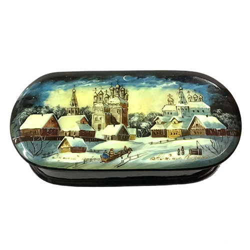 Лаковая миниатюра Шкатулка "Зимний пейзаж". Ручная роспись.