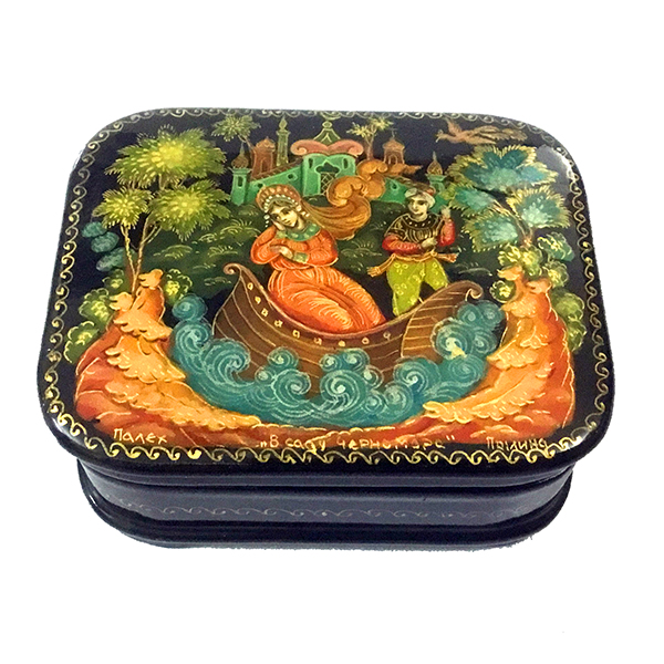 Лаковая миниатюра Шкатулка Палех "В саду Черномора". Ручная роспись.