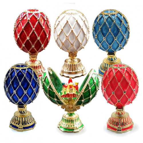 Яйцо-шкатулка под Фаберже, внутри с храмом. Изготовлена из метала, покрыта цветной эмалью и украшена стразами.