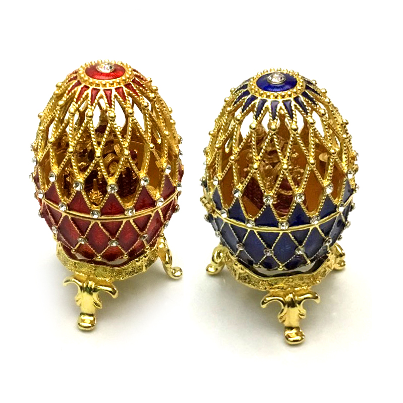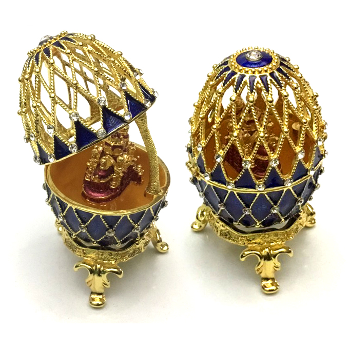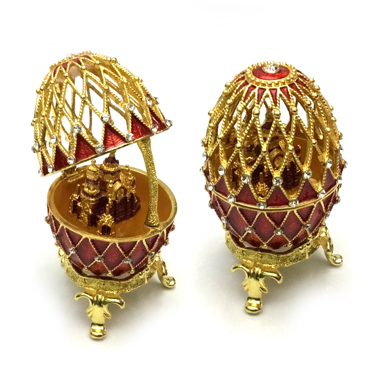 Роскошная шкатулка – яйцо в стиле Фаберже с храмом внутри изготовлено из металла, покрыто холодной эмалью и инкрустировано стразами.