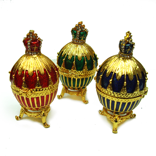 Роскошная шкатулка – яйцо в стиле Фаберже изготовлено из металла, покрыто холодной эмалью и инкрустировано стразами.