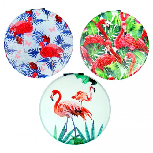 Зеркало металлическое с отделкой из искусственной кожи, двустороннее, круглое, на магните с разными изображениями Фламинго.