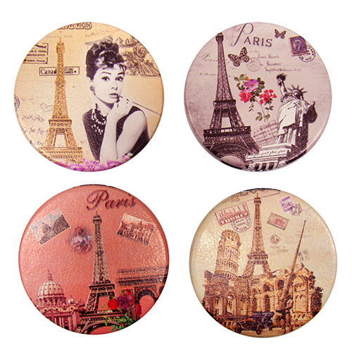 Зеркало металлическое с отделкой из искусственной кожи двустороннее круглое на магните с разными изображениями Европейских городов.