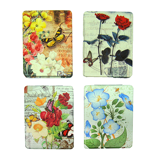 Зеркало металлическое с отделкой из искусственной кожи двустороннее прямоугольное на магните с разными изображениями Цветов.