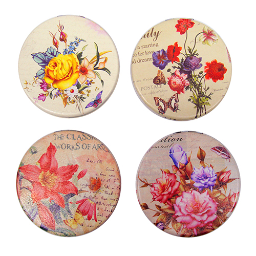 Зеркало металлическое с отделкой из искусственной кожи двустороннее круглое на магните с разными изображениями Цветов.