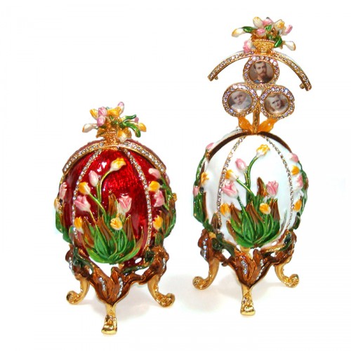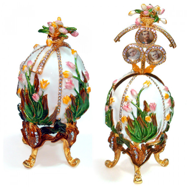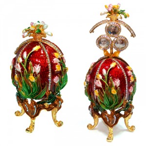 Яйце-шкатулка під Фаберже "Конвалії". Виготовлено з металу, покрито кольоровою емаллю та прикрашено стразами.