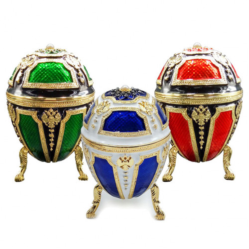 Яйце-шкатулка під Фаберже, виготовлено  з металу, покрито кольоровою емаллю і прикрашено  стразами.