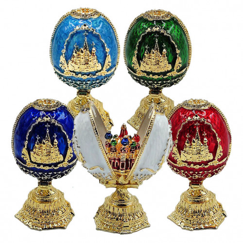 Яйце-шкатулка під Фаберже,  усередині з храмом Василия  Блаженного на магниті. Виготовлена з металу, покрита кольоровою емаллю та прикрашена стразами.