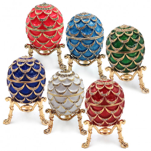 Яйце-шкатулка Фаберже, виготовлена з металу, покрита кольоровою емаллю і прикрашена стразами.