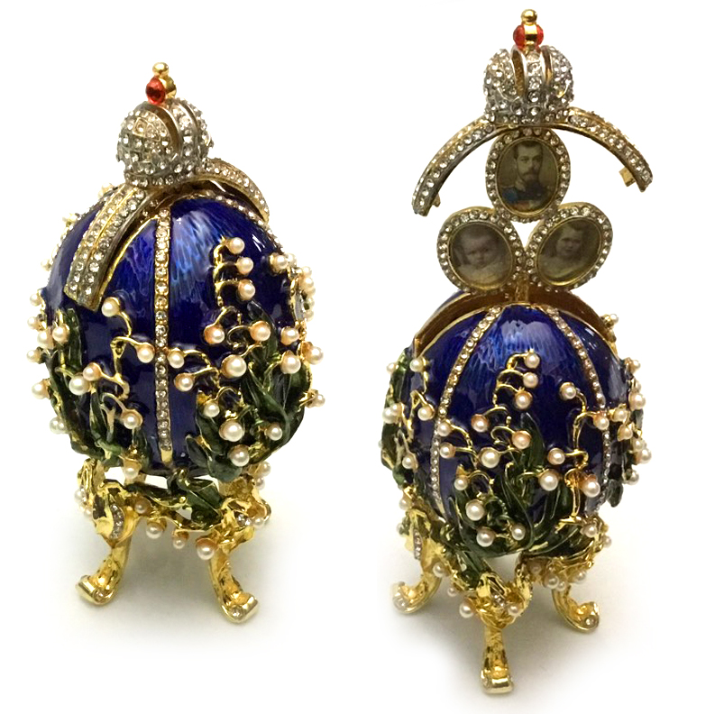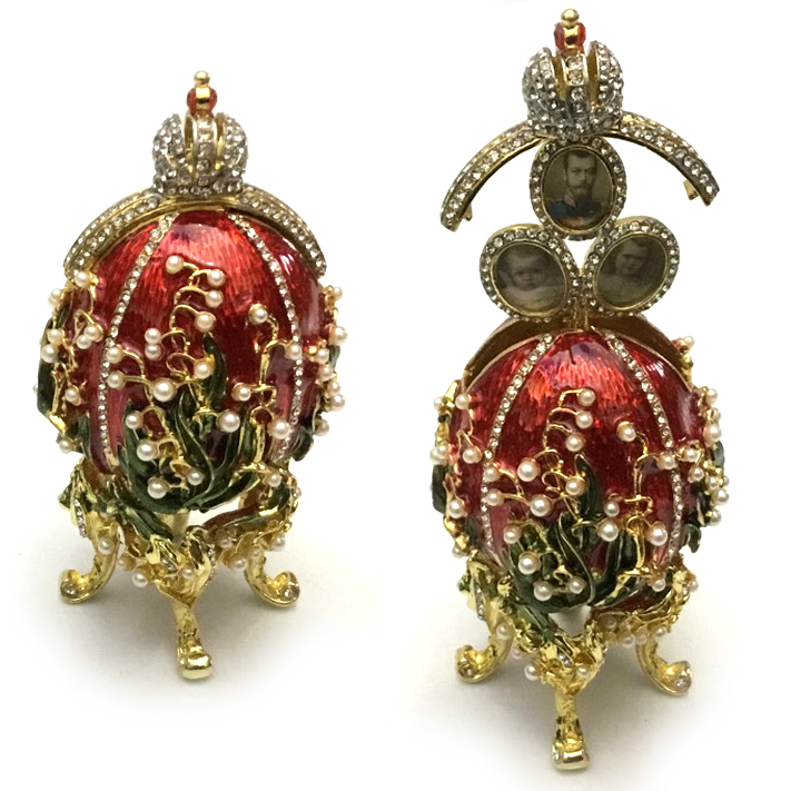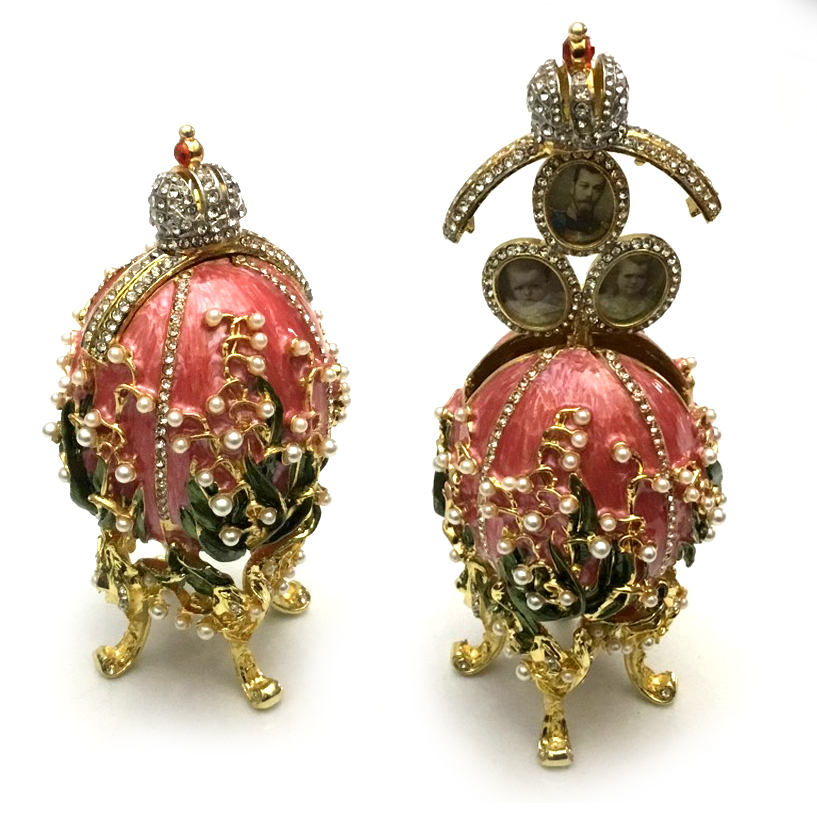 Розкішна шкатулка - яйце в стилі Фаберже 'Ландиші' виготовлено з металу, покрито холодною емаллю, інкрустовано стразами і перлою.