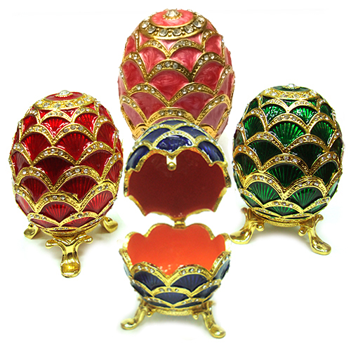Розкішна шкатулка - яйце в стилі Фаберже виготовлено з металу, покрито холодною емаллю і інкрустовано стразами.