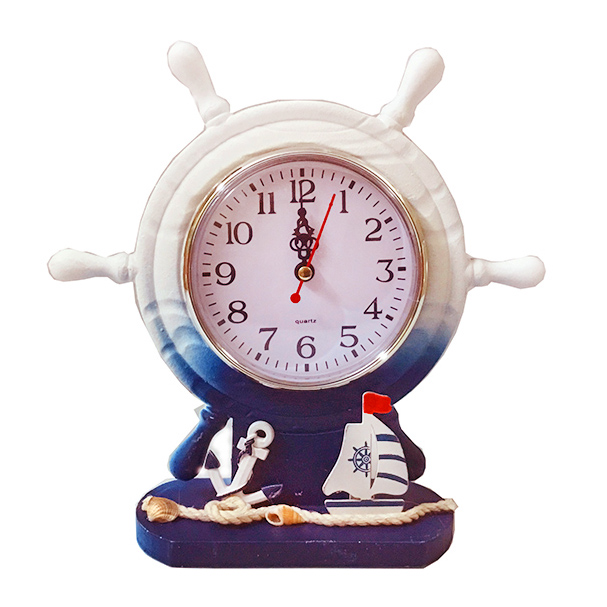 Годинник настільний кварцевий у вигляді штурвала з декоративними елементами з полістоуну на морську тему.