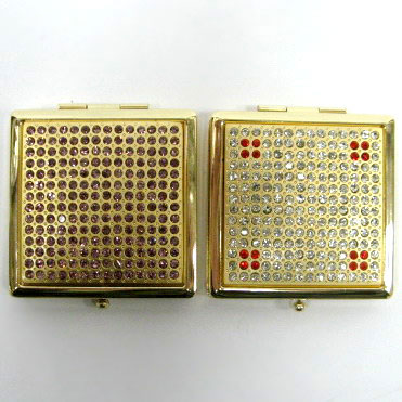 Дзеркальце двостороннє косметичне, прямокутне з металу зі стразами.